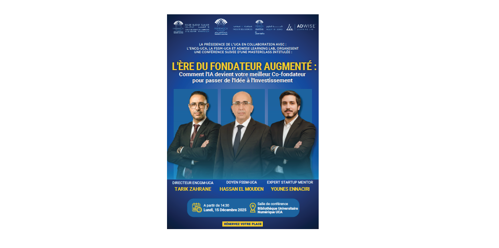 L'ENCG Marrakech organise en collaboration avec la présidence de l'Université Cadi Ayyad et la Faculté des Sciences Semlalia ainsi que l'agence AD Wise une conférence suivie d'une masterclass sur le thème "L'ère du fondateur augmenté : Comment l'IA devient votre meilleur co-fondateur pour passer de l'idée çà l'investissement".