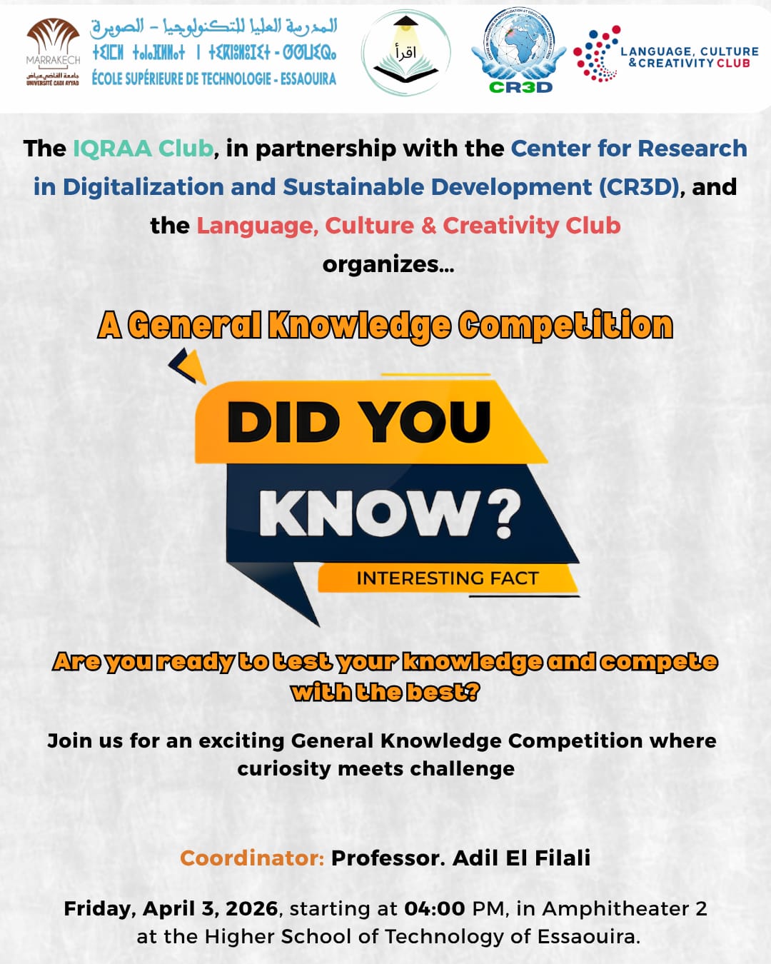 The IQRAA Club, in partnership with the Center for Research in Digitalization and Sustainable Development (CR3D) and the Language, Culture & Creativity Club, is pleased to announce an exciting General Knowledge Competition entitled “Did You Know?”