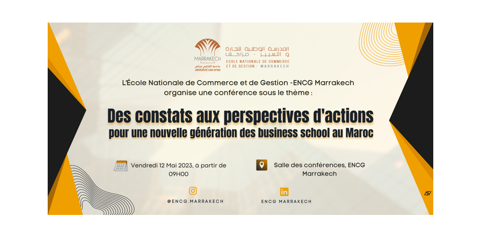 L'ENCG Marrakech organise la conférence « Des constats aux perspectives d’actions : vers une nouvelle génération de Business School au Maroc », autour d’une réflexion collective sur l’excellence académique et scientifique, notamment les nouvelles pratiques pédagogiques et didactiques susceptibles de forger les managers de demain. La conférence aura lieu le Vendredi 12 Mai 2023 à partir de 09h00 à la Salle Polyvalente de l’ENCG Marrakech.