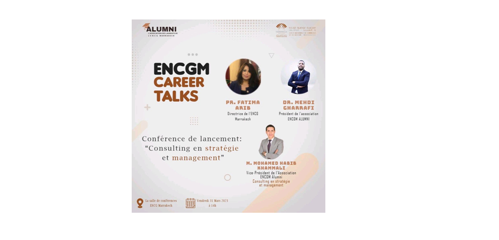 L'ENCG Marrakech et l'Association ALUMNI ENCG Marrakech organisent la conférence de lancement des "ENCGM Career Talks" sur le thème "Consulting en stratégie et en management", et ce le vendredi 31 Mars 2023 à partir de 14h00 à la Salle de conférences, ENCG Marrakech.