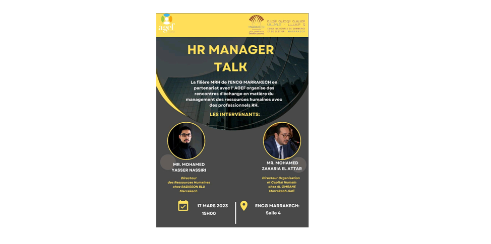 La filière Management des Ressources Humaines de l'ENCG Marrakech en partenariat avec l'AGEF organise le "HR Manager Talk", une rencontre d'échange en matière de ressources humaines avec des professionnels RH notamment Mr. Mohamed Yasser NASSIRI, DRH du Radisson BLU Marrakech et Mr. Mohamed Zakaria EL ATTAR, Directeur Organisation et Capital Humain chez Al Omrane Marrakech-Safi, et ce le Vendredi 17 Mars 2023 à partir de 15h00 à la Salle 4, ENCG Marrakech.