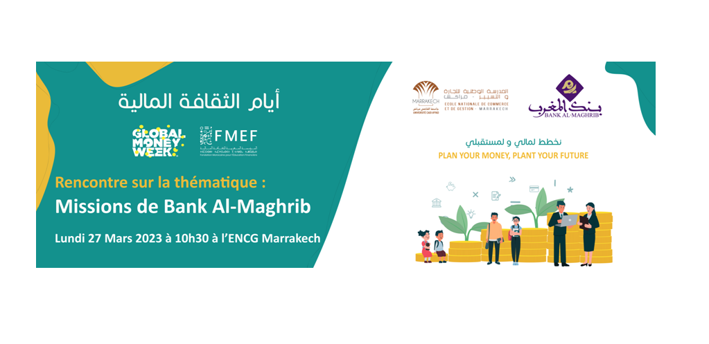 Dans le cadre du Global Money Week 2023, l'ENCG Marrakech et Bank Al-Maghrib organisent une rencontre sur la thématique "Missions de Bank Al-Maghrib", le Lundi 27 Mars 2023 à 10h30 à la salle de conférences à l'ENCG Marrakech.