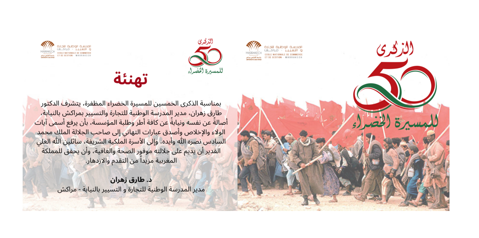 بمناسبة الذكرى الخمسين للمسيرة الخضراء المظفرة، يتشرف الدكتور طارق زهران، مدير المدرسة الوطنية للتجارة والتسيير بمراكش بالنيابة، أصالةً عن نفسه ونيابةً عن كافة أطر وطلبة المؤسسة، بأن يرفع أسمى آيات الولاء والإخلاص وأصدق عبارات التهاني إلى صاحب الجلالة الملك محمد السادس نصره الله وأيده، وإلى الأسرة الملكية الشريفة، سائلين الله العلي القدير أن يديم على جلالته موفور الصحة والعافية، وأن يحقق للمملكة المغربية مزيداً من التقدم والازدهار.