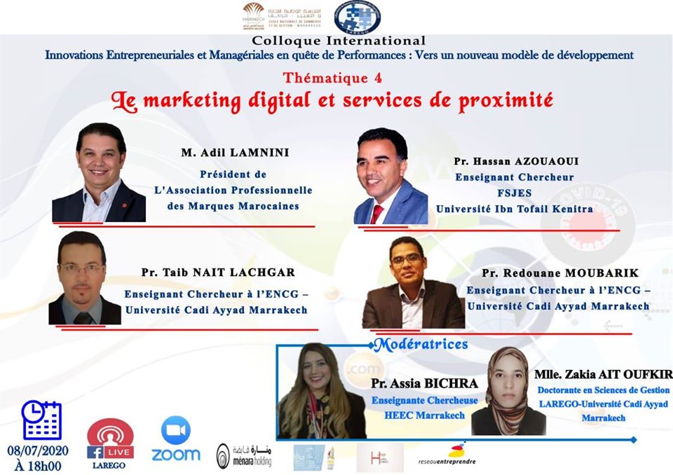 Dans le cadre de ses activités scientifiques, le Laboratoire de Recherche En Gestion des Organisations (LAREGO) organise, en collaboration avec l'ENCG Marrakech et en partenariat avec le Groupe Menara-Holding, le Réseau Entreprendre Maroc et le Centre des Jeunes Dirigeants, un colloque international virtuel "Innovations Entrepreneuriales et Managériales en quête de Performances : Vers un nouveau modèle de développement" sous forme d'un cycle de visioconférences sur la période du 12 juin au 15 juillet 2020.