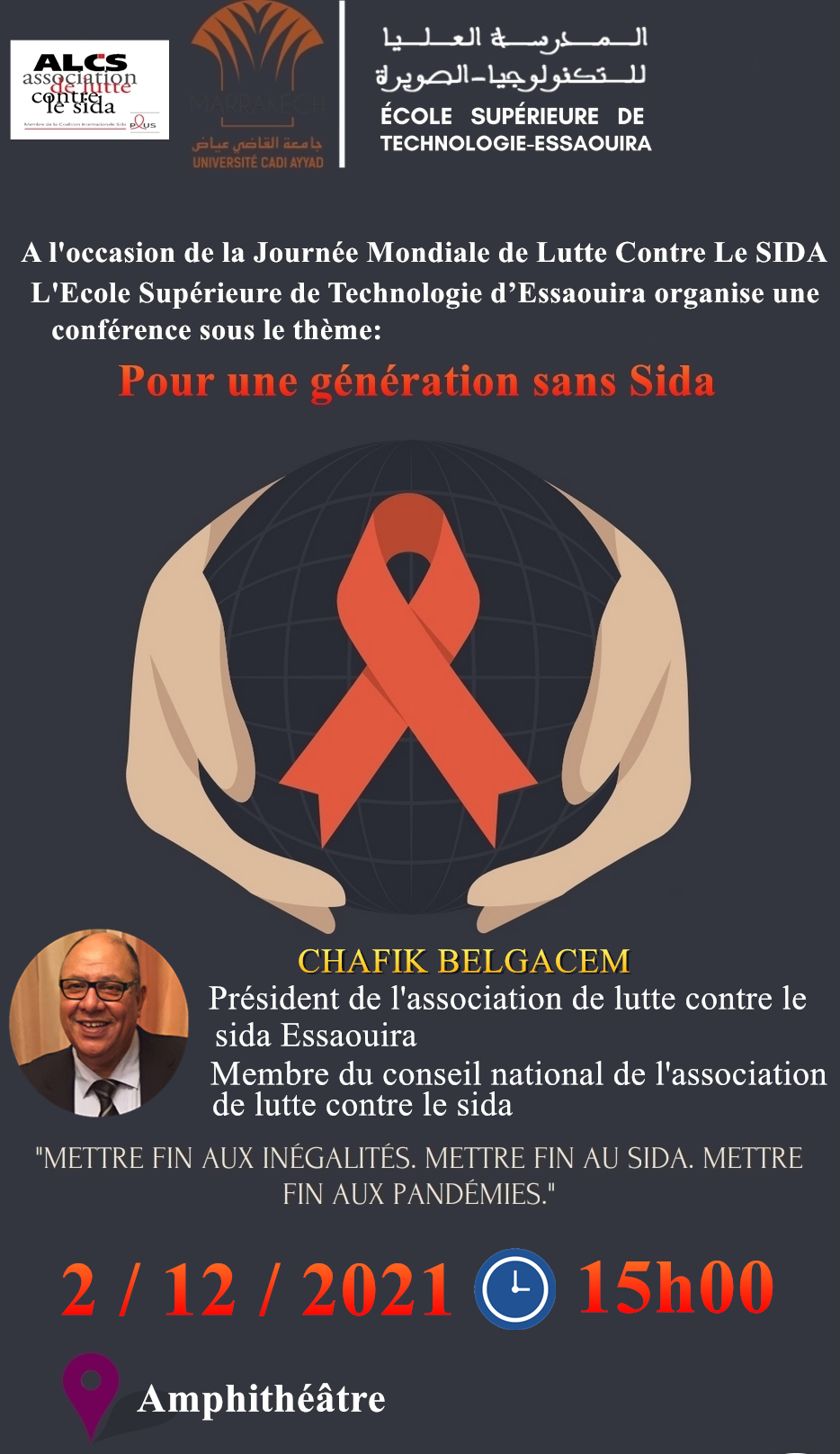 À l'occasion de la journée mondiale de la lutte contre le SIDA, l'École Supérieure de Technologie Essaouira et l'association de lutte contre le SIDA Essaouira organisent une conférence sous le thème: Pour une génération sans SIDA. et ce le jeudi 02 décembre 2021 à 15h.