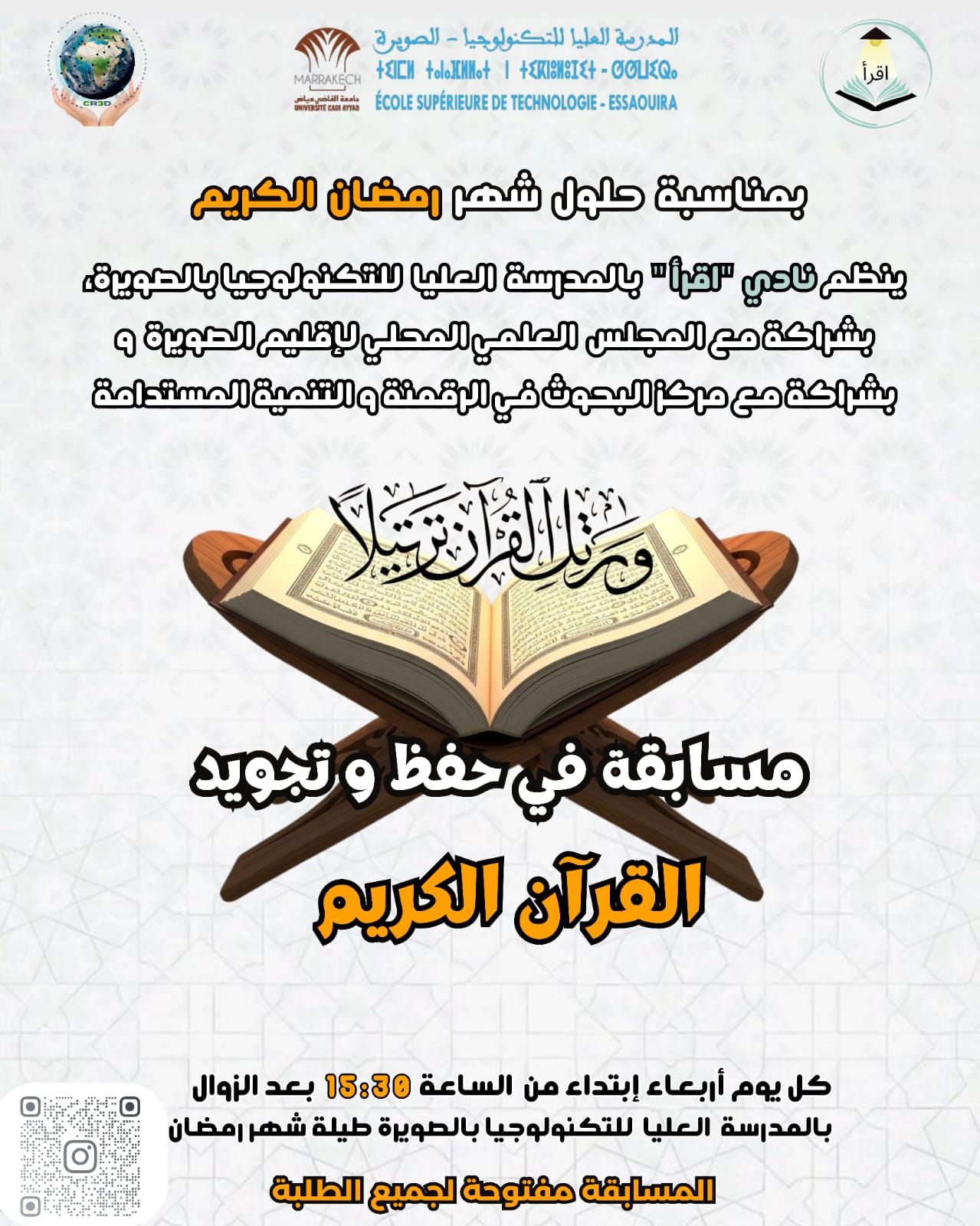 بمناسبة حلول شهر رمضان الكريم، ينظم نادي "اقرأ" بالمدرسة العليا للتكنولوجيا بالصويرة، بشراكة مع المجلس العلمي المحلي لإقليم الصويرة ومركز البحوث في الرقمنة والتنمية المستدامة، مسابقة في حفظ وتجويد القرآن الكريم. وذلك كل يوم أربعاء ابتداءً من الساعة 15:30 بعد الزوال، بالمدرسة العليا للتكنولوجيا بالصويرة، طيلة شهر رمضان. المسابقة مفتوحة في وجه جميع الطلبة الراغبين في المشاركة، في أجواء إيمانية تهدف إلى تشجيع الإقبال على كتاب الله وتعزيز قيم التدبر والتجويد. للتسجيل المرجوا التواصل مع مكتب نادي اقرأ .
