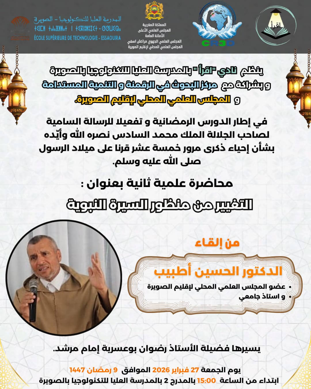 في إطار الدروس الرمضانية وتفعيل الرسالة السامية لصاحب الجلالة الملك محمد السادس نصره الله، واحتفاء بذكرى ميلاد خير البرية سيدنا محمد صلى الله عليه وسلم، ينظم نادي “اقرأ” بالمدرسة العليا للتكنولوجيا بالصويرة، بشراكة مع مركز البحوث في الرقمنة والتنمية المستدامة والمجلس العلمي المحلي لإقليم الصويرة، المحاضرة العلمية الثانية خلال هذا الشهر المبارك، تحت عنوان: