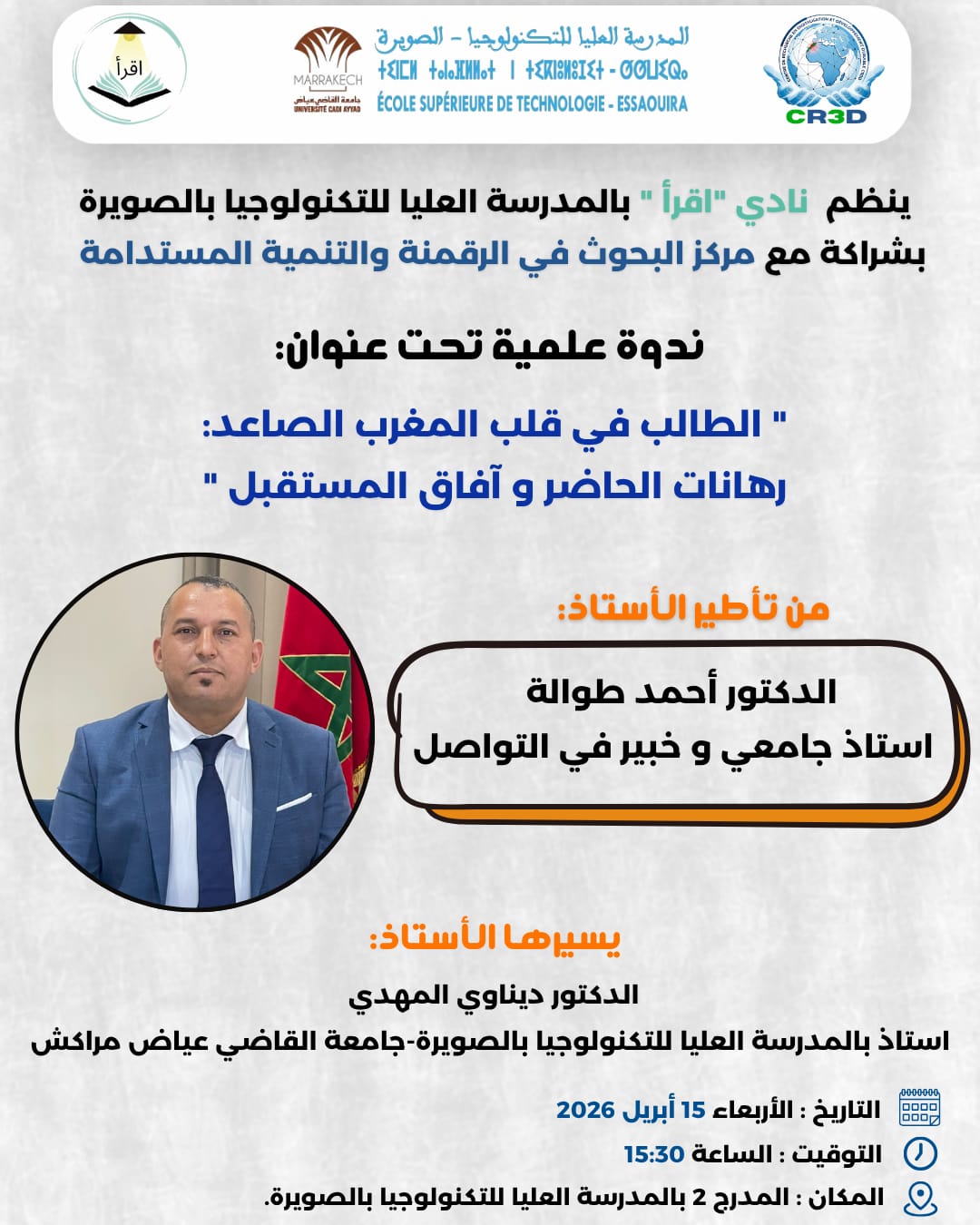 ينظم نادي "اقرأ" بالمدرسة العليا للتكنولوجيا بالصويرة بشراكة مع مركز البحوث في الرقمنة والتنمية المستدامة (CR3ض)، ندوة علمية تحت عنوان: