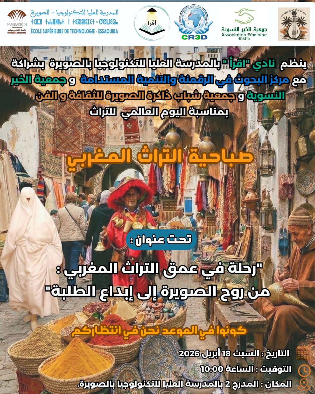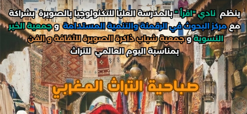 في إطار الاحتفاء باليوم العالمي للتراث، ينظم نادي "اقرأ" بالمدرسة العليا للتكنولوجيا بالصويرة، بشراكة مع مركز البحوث في الرقمنة والتنمية المستدامة، وجمعية الخير النسوية، وجمعية شباب ذاكرة الصويرة للثقافة والفن، تظاهرة ثقافية متميزة تحت عنوان: "رحلة في عمق التراث المغربي: من روح الصويرة إلى إبداع الطلبة"، وذلك يوم السبت 18 أبريل 2026 على الساعة 10:00 صباحًا بالمدرج رقم 2.