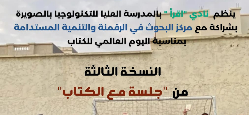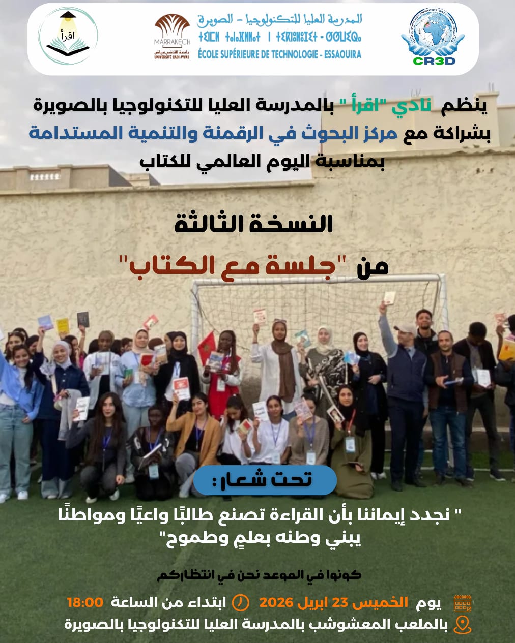 في إطار الاحتفاء باليوم العالمي للكتاب، ينظم نادي "اقرأ" بالمدرسة العليا للتكنولوجيا بالصويرة، بشراكة مع مركز البحوث في الرقمنة والتنمية المستدامة، النسخة الثالثة من تظاهرة "جلسة مع الكتاب".