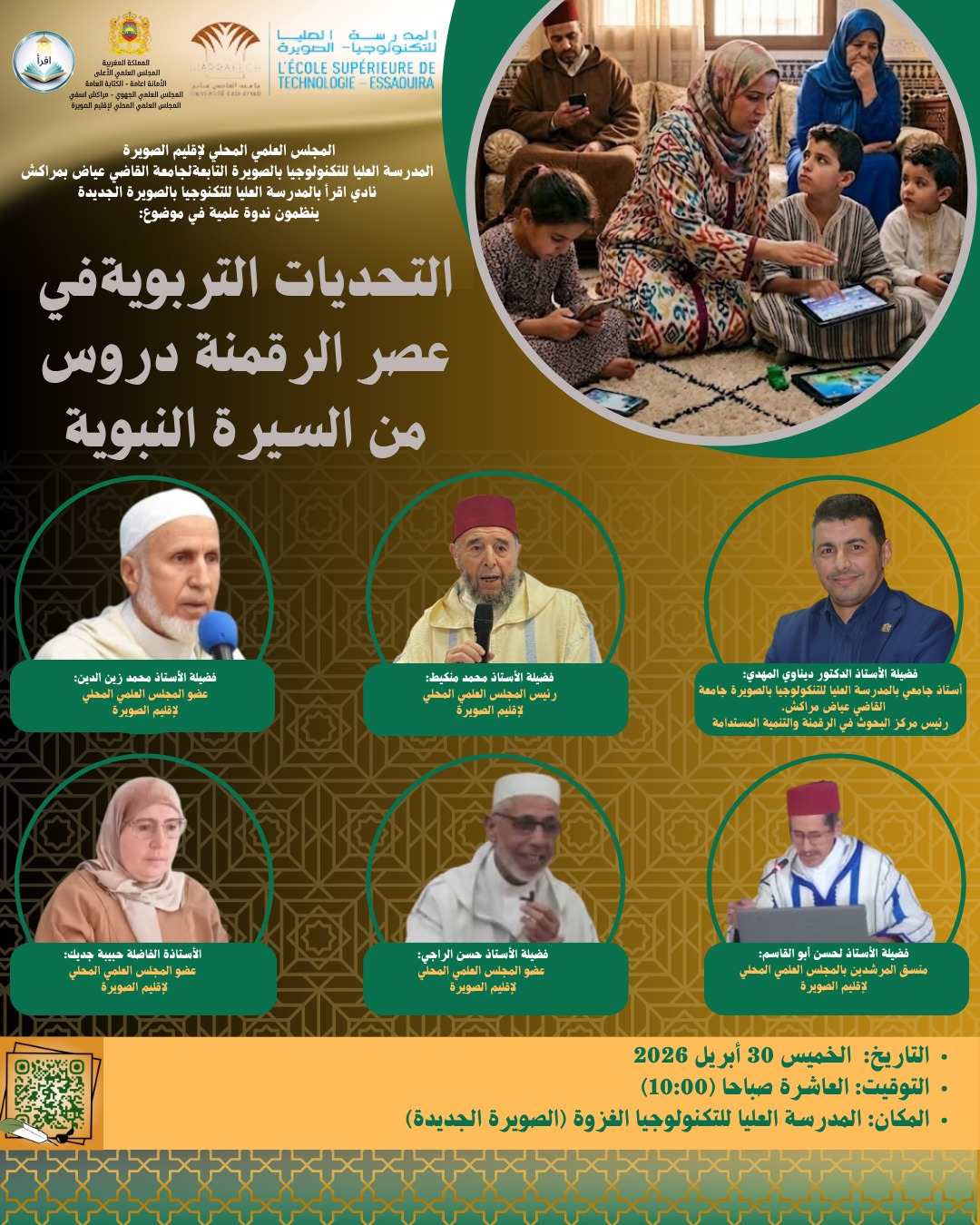 في إطار مواكبة التحولات التي يعرفها المجال التربوي في ظل الثورة الرقمية، تنظم المدرسة العليا للتكنولوجيا بالصويرة، بشراكة مع المجلس العلمي المحلي لإقليم الصويرة ونادي "اقرأ"، ندوة علمية تحت عنوان: "التحديات التربوية في عصر الرقمنة: دروس من السيرة النبوية". ويأتي هذا اللقاء العلمي بهدف مناقشة أبرز الإشكالات التربوية المعاصرة واستحضار القيم والمبادئ المستمدة من السيرة النبوية لإيجاد مقاربات متوازنة تجمع بين الأصالة ومتطلبات العصر الرقمي.