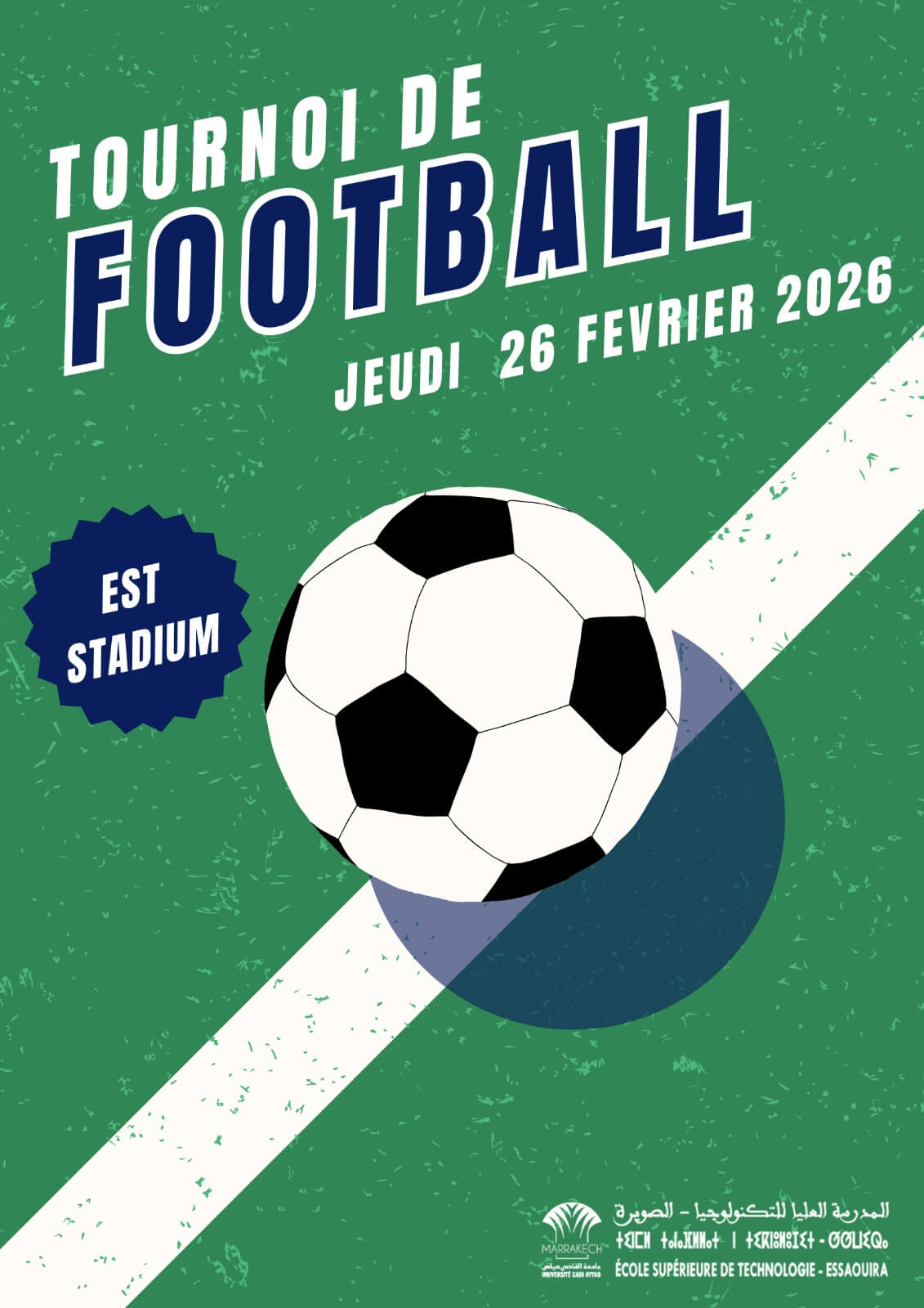 L’École Supérieure de Technologie d’Essaouira a le plaisir d’annoncer l’organisation de son Tournoi de Football 2026, qui se tiendra :