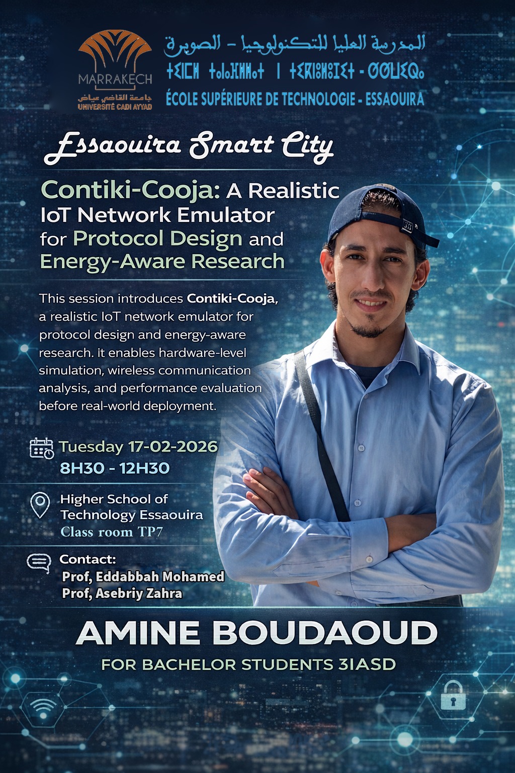 This session introduces Contiki-Cooja, a realistic IoT network emulator for protocol design and energy-aware research. It enables hardware-level simulation, wireless communication analysis, and performance evaluation before real-world deployment.