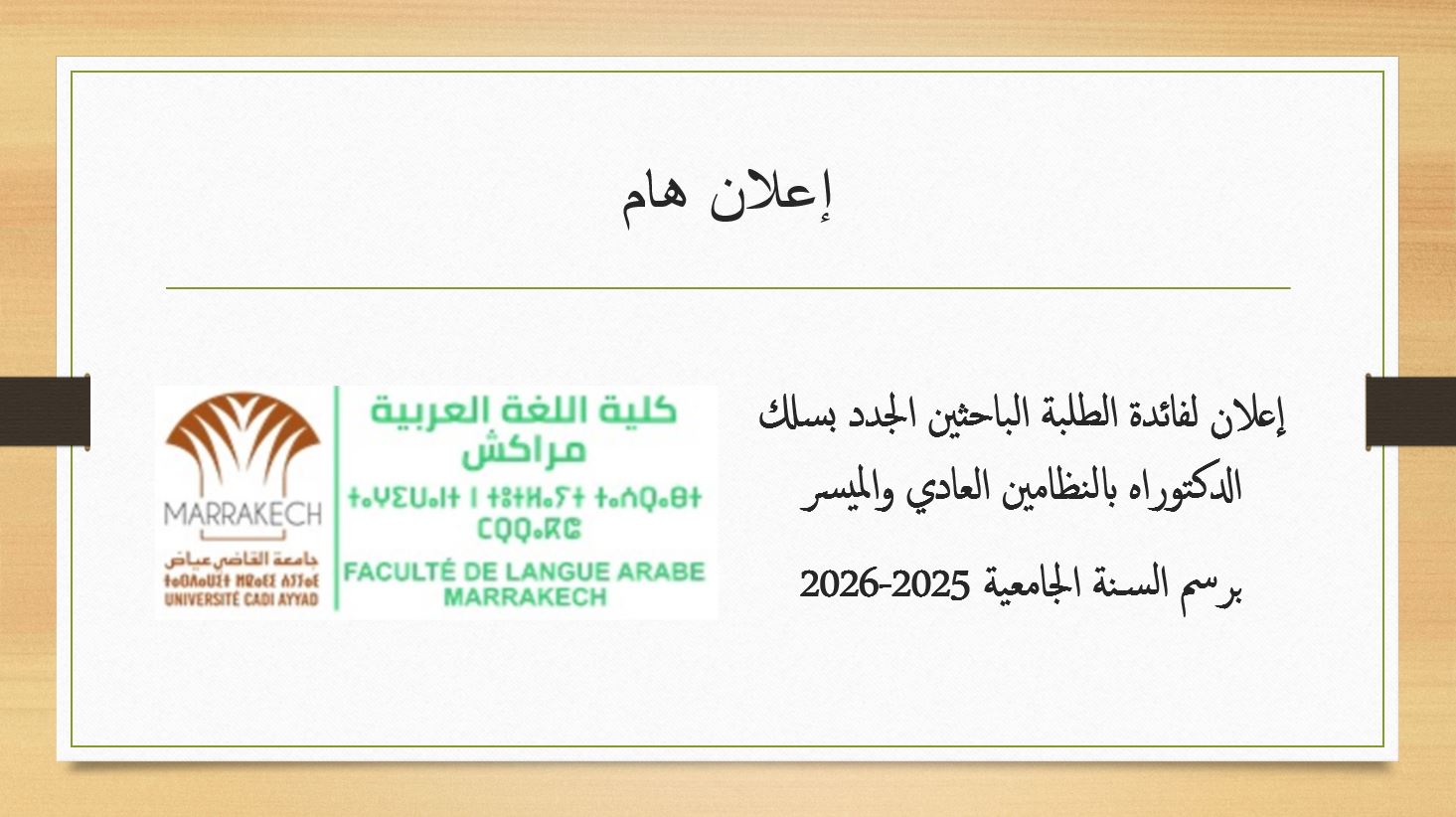 يخبر عميد كلية اللغة العربية بمراكش الطلبة الباحثين الجدد المسجلين بسلك الدكتوراه برسم السنة الجامعية 2025-2026، في النظامين: التوقيت العادي والتوقيت الميسر، أنه يتعين عليهم إلزاميا القيام بما يلي: