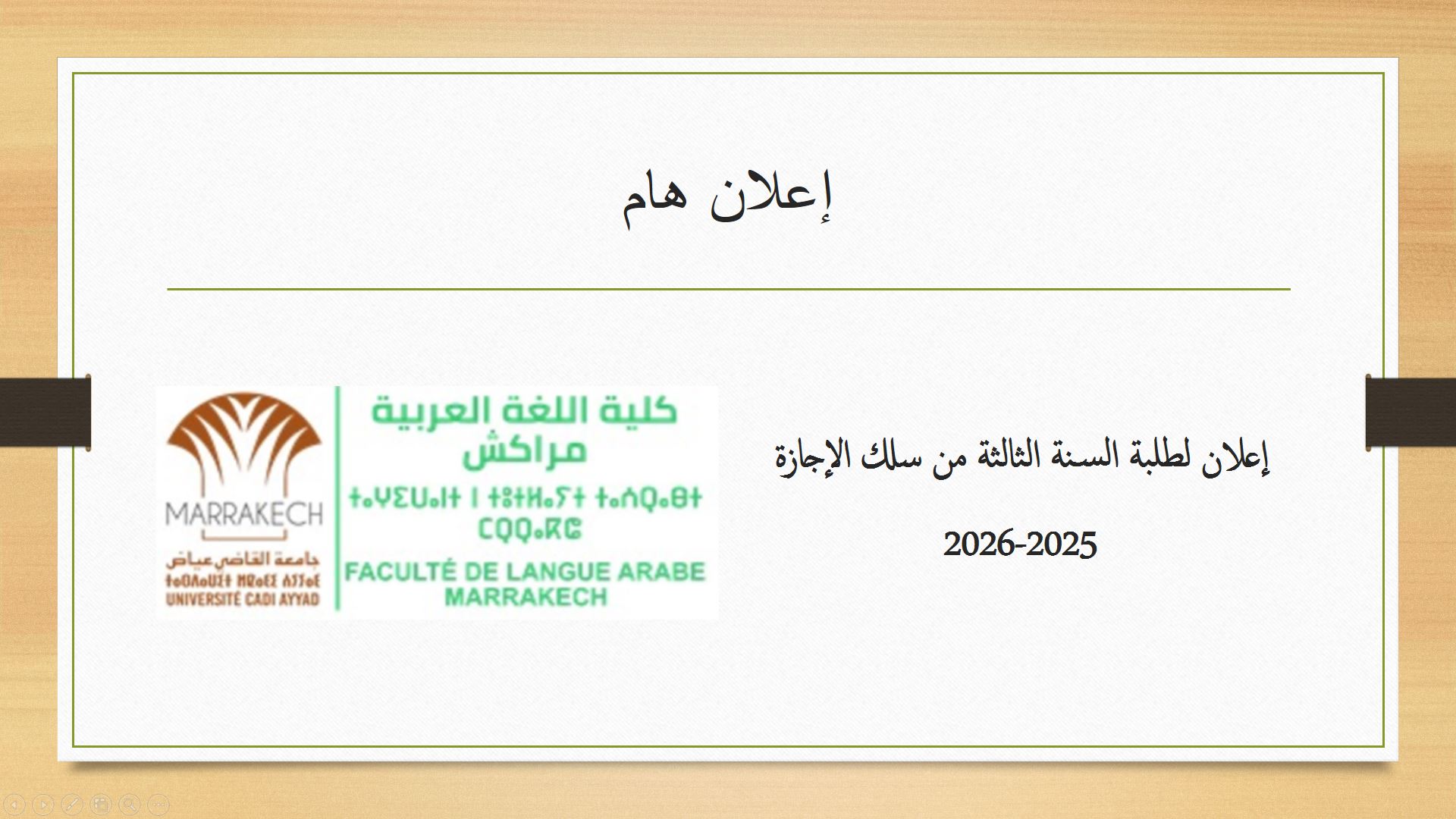 يُنهي السيد عميد كلية اللغة العربية مراكش بالنيابة إلى علم جميع الطلبة بمختلف المسالك والمؤهلين لنيل شهادة الإجازة برسم السنة الجامعية 2025-2026، أنه يتعين عليهم إيداع نسختين من البطاقة الوطنية للتعريف سارية المفعول، مع التأكد من صحة المعلومات بها، وذلك قبل 17 أبريل 2026.