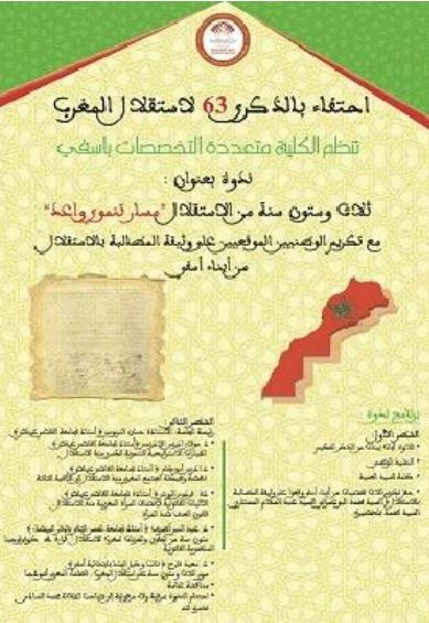 احتفاء بالذكرى الثالثة والأربعين للمسيرة الخضراء المظفرة والذكرى الثالثة والستين لعيد الاستقلال المجيد ، ستنظم الكلية متعددة التخصصات بأسفي ندوة وطنية بعنوان : " ثلاث وستون سنة من الاستقلال : مسار تنموي واعد " وذلك مساء يوم الأربعاء 14 نونبر 2018 مساء بقاعة الندوات بالكلية .. سيشارك فيها ثلة من الأساتذة .وسيتم تكريم أسماء الوطنيين الذين وقعوا على وثيقة المطالبة بالاستقلال من أبناء أسفي بحضور أهاليهم .