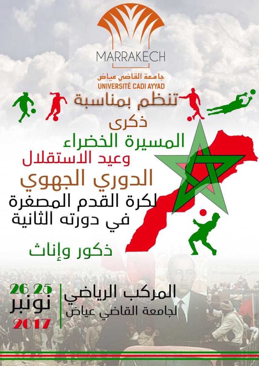 تنظم جامعة القاضي عياض بمناسبة ذكرى المسيرة الخضراء المظفرة وعيد الإستقلال المجيد دوري جهوي في كرة القدم المصغرة ذكور وإناث، وذلك يومي 25 و26 نونبر 2017 بالقاعة المغطاة التابعة للمركب الرياضي الجامعي