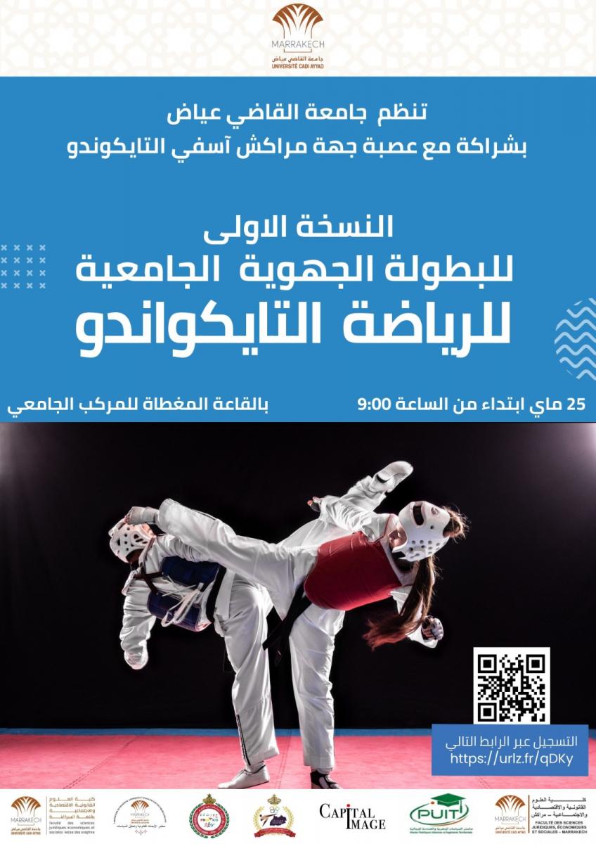 التزاما منها بتعزيز الأنشطة الرياضية، وتقديم بيئة داعمة ومحفزة لتطوير مواهب الطلاب ومهاراتهم الرياضية، وفرصة للتفاعل والتعارف مع زملائهم من خلال التنافس الرياضي الشريف، وتعزيزا للصحة واللياقة البدنية في أوساط الشباب، تنظم جامعة القاضي عياض، بشراكة مع العصبة الجهوية للرياضة الجامعية جامعة القاضي عياض، وعصبة جهة مراكش-اسفي للتايكواندو وطلبة ماستر السياسات الحضرية والهندسة المجالية بكلية العلوم القانونية والاقتصادية والاجتماعية بجامعة القاضي عياض، النسخة الأولى من البطولة الجهوية لرياضة التايكواندو ، يوم 25 ماي 2024، تحت شعار " التايكواندو فن الانضباط والتفوق" وذلك برحاب القاعة المغطاة التابعة للمركب الرياضي الجامعي.