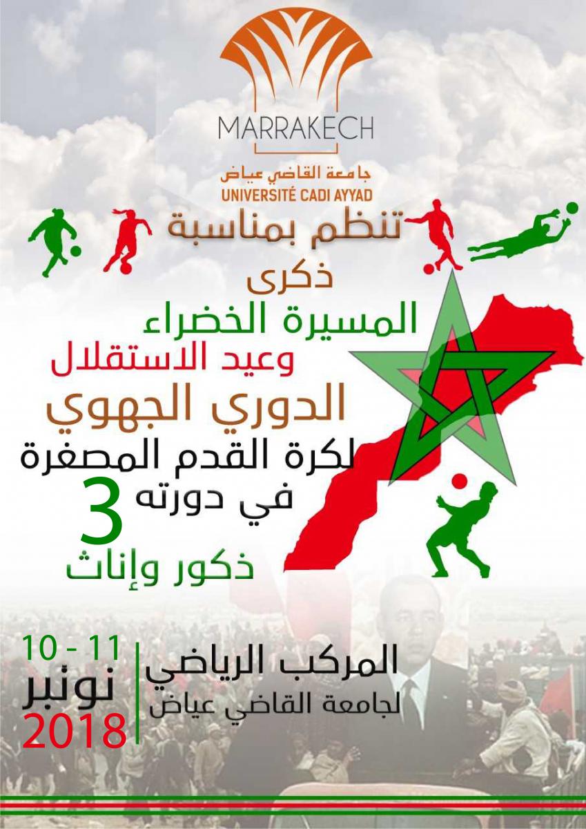 احتفالا بالذكرى 43 للمسيرة الخضراء المظفرة وعيد الاستقلال المجيد، تنظم جامعة القاضي عياض دوري جهوي في كرة القدم المصغرة ذكور و اناث وذلك يومي 10 و 11 نونبر 2018 بالقاعة المغطاة التابعة للمركب الرياضي الجامعي.