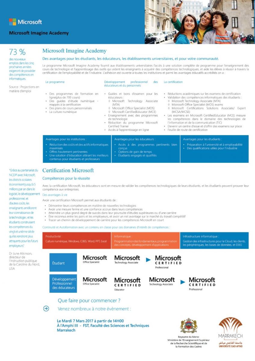 Le Centre de Certification de l’Université Cadi Ayyad organise en partenariat avec Microsoft ainsi que le Ministère de l’Enseignement Supérieur, de la Recherche Scientifique et de la Formation des Cadres un événement d’information sur “Imagine Academy” le Mardi 7 Mars 2017 à la FST à partir de 14h00 à l’Amphi 3.