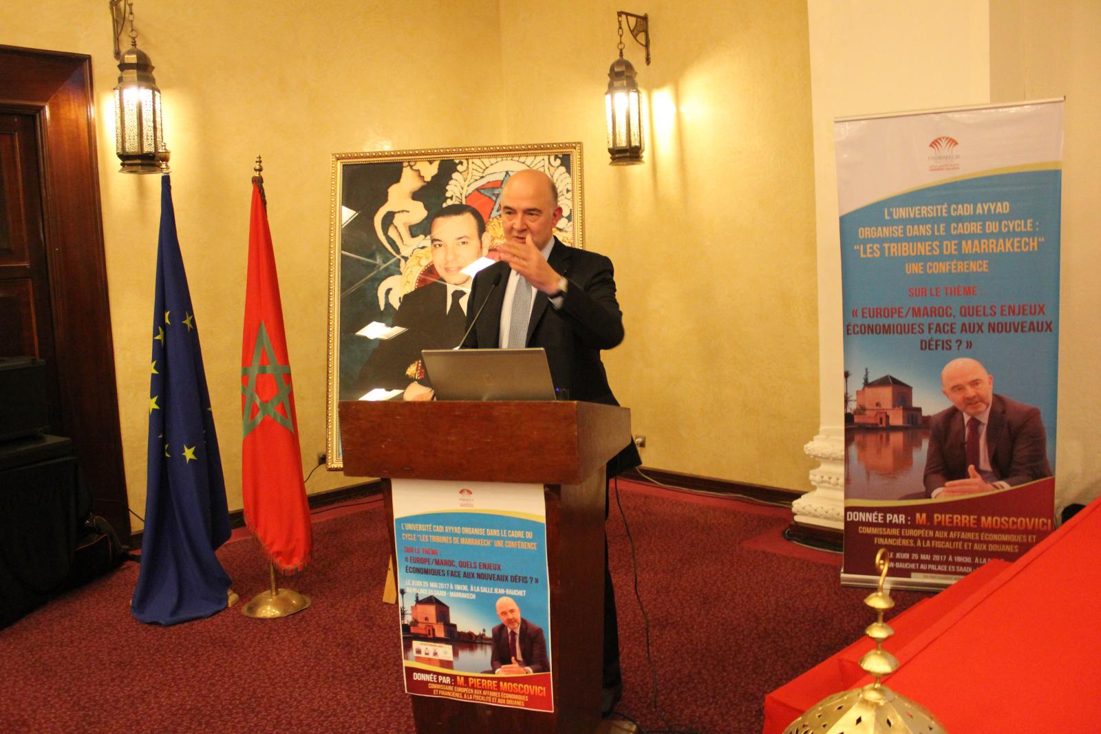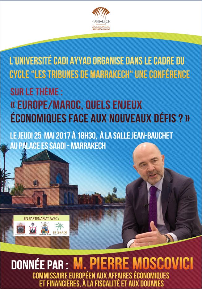 L’Université Cadi Ayyad a l’honneur d’accueillir M. Pierre MOSCOVICI, Ancien Ministre français de l'Économie et des Finances et Commissaire européen aux Affaires économiques et financières, à la Fiscalité et aux Douanes, pour donner une conférence sous le thème « Europe/Maroc, quels enjeux économiques face aux nouveaux défis?» le Jeudi 25 Mai 2017 à 18h30, à la salle Jean-Bauchet au Palace Es Saadi.