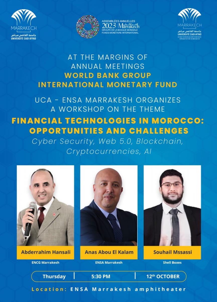 At the margin of annual meetings World Bank Group International Monetary Fund, UCA - ENSA Marrakech organizes a workshop on the theme: Financial technologies in Morocco: opportunities and challenges, Thursday 12th october, 5:30 PM at ENSA of Marrakech.