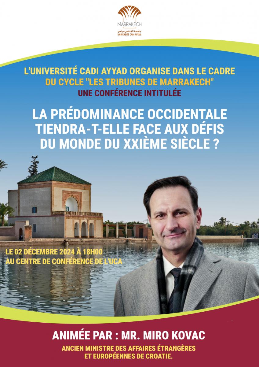 Dans le cadre du cycle des grandes conférences « Les Tribunes de Marrakech », l'Université Cadi Ayyad a le plaisir d’accueillir Monsieur Miro KOVAC, ancien Ministre des Affaires étrangères de Croatie, animera une conférence sous le thème : « La Prédominance Occidentale tiendra-t-elle face aux défis du monde du XXIème siècle ? ».