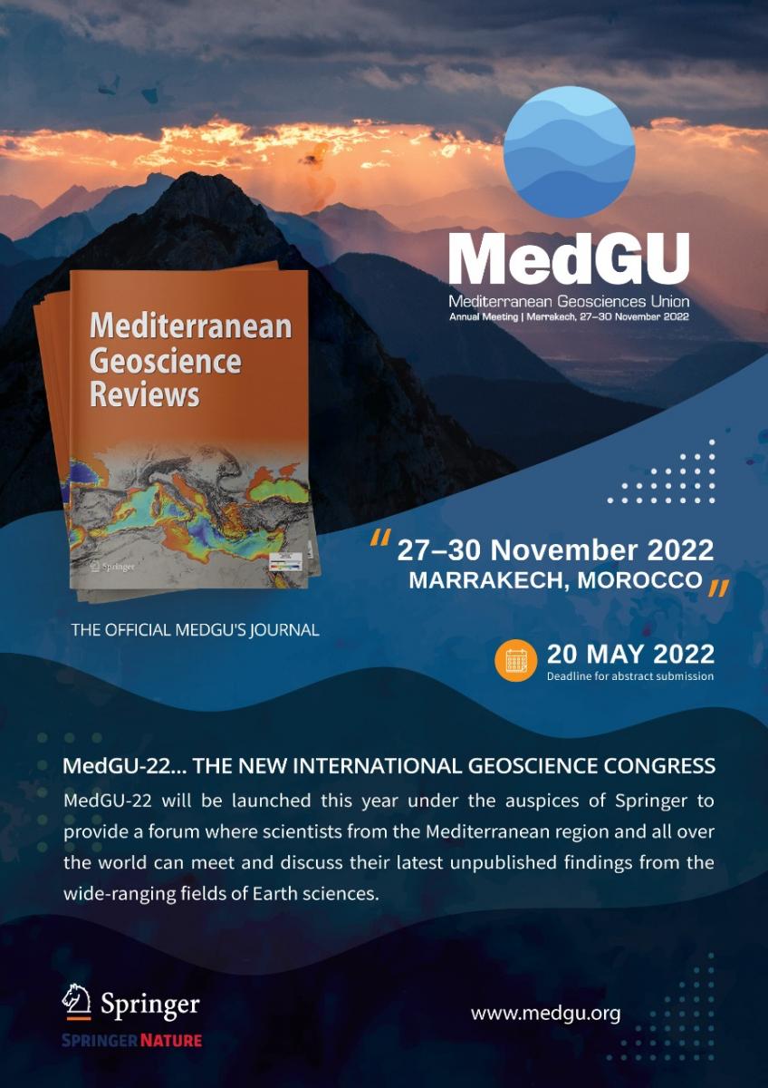 L’Université Cadi Ayyad et l’Université Ibn Tofail de Kénitra et l’Union Méditerranéenne des Géosciences MedGU, coorganisent avec la collaboration de l’Éditeur Springer Nature, du 27 au 30 Novembre 2022 au centre de conférence de l’Université Cadi ayyad, la deuxième édition du Meeting Annuel de l’Union Méditerranéenne des Géosciences – MedGU-22.