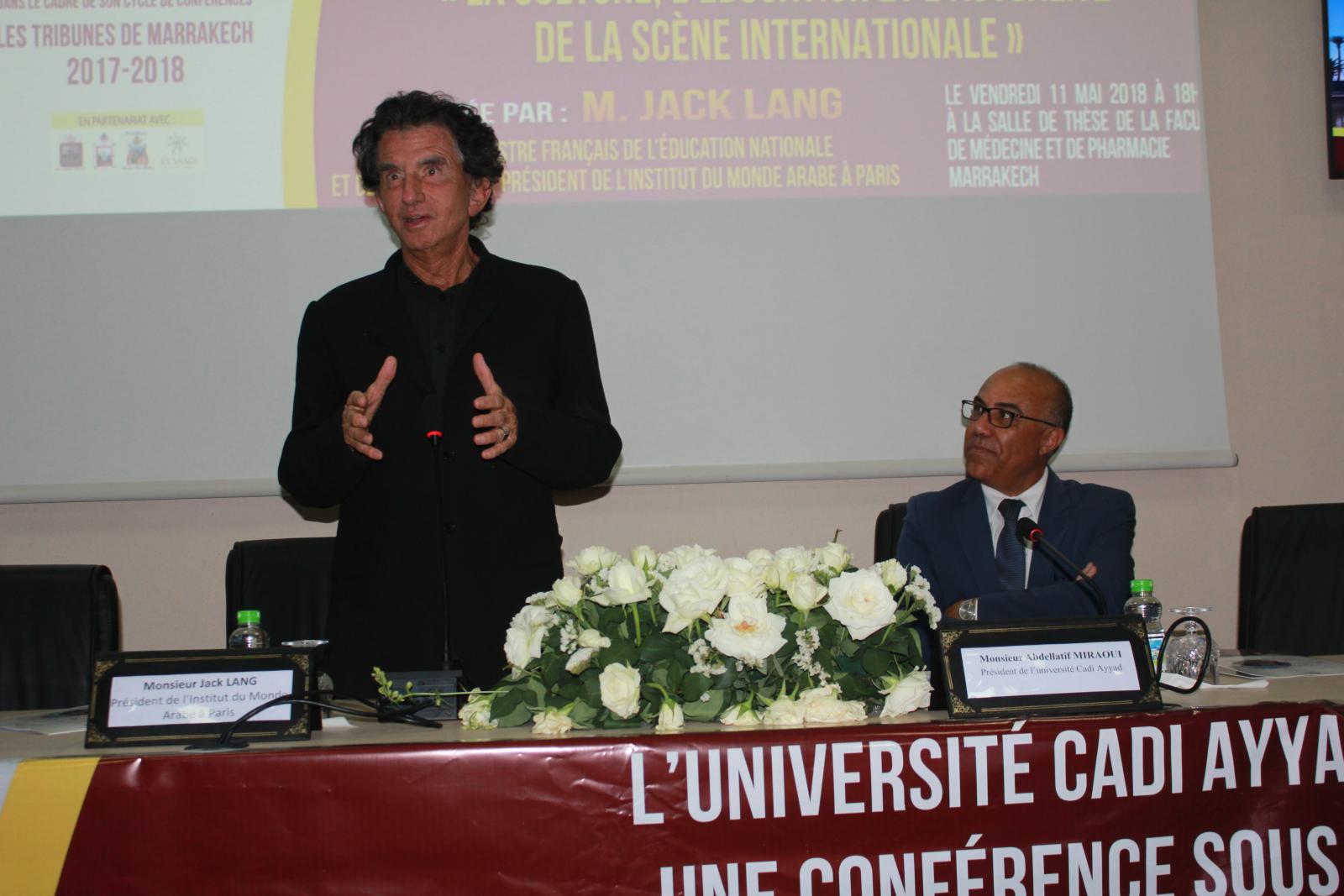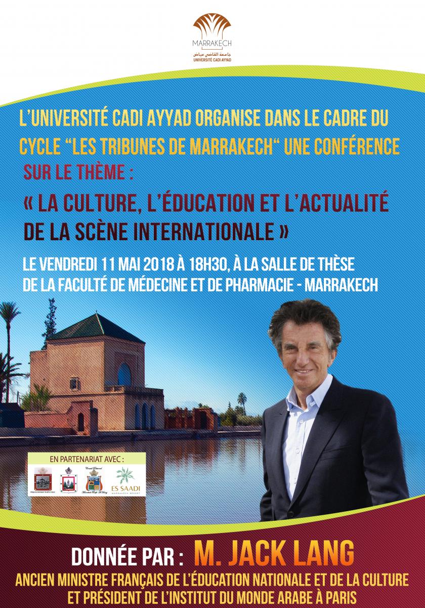 L’université Cadi Ayyad a l’honneur d’accueillir Monsieur Jacques LANG, Ancien Ministre français de l’Éducation Nationale et de la Culture et Président de l’Institut du Monde Arabe à Paris, pour échanger et débattre autour du thème : « La culture, l’éducation et l’actualité de la scène internationale », le Vendredi 11 mai 2018 à 18h30, à la salle de thèse de la Faculté de Médecine et de Pharmacie.