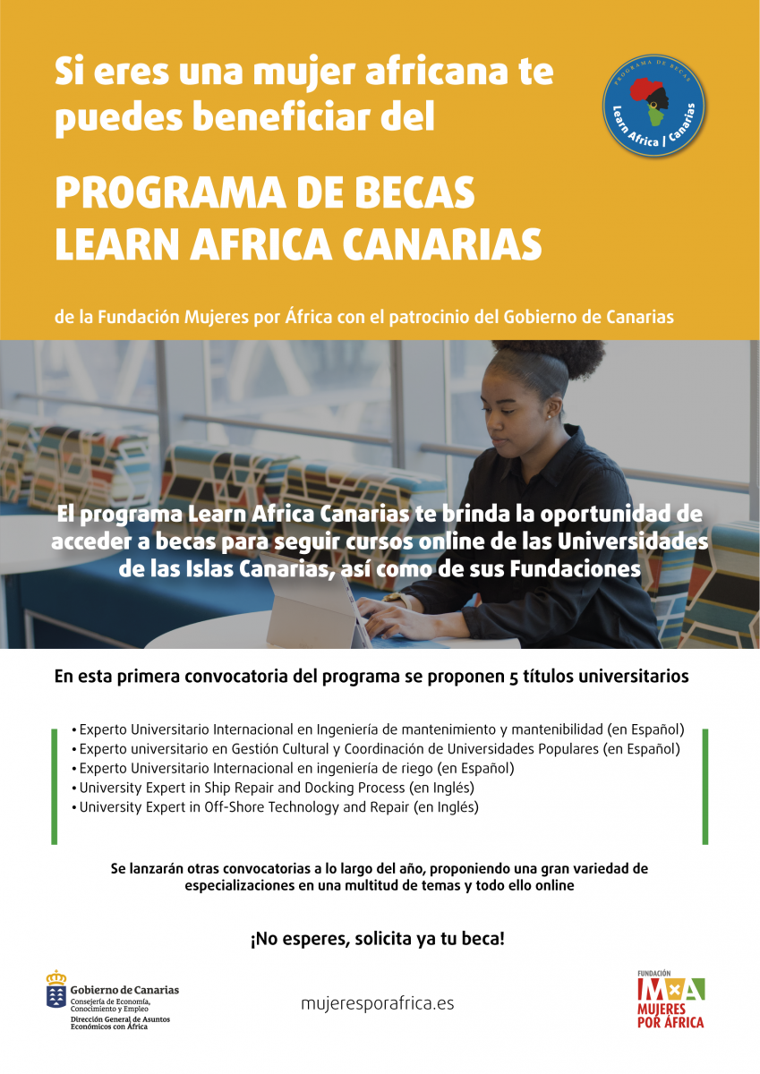 J’ai l’honneur et le plaisir de vous envoyer ci-joint l’affiche (en espagnol et en anglais) concernant le nouveau programme de bourses « Learn Africa-Canarias » que la Fondation Femmes pour l'Afrique vient de lancer avec le parrainage du Ministère régional de l'économie, de la connaissance et de l'emploi du Gouvernement des Canaries et qui vise à ouvrir de nouvelles possibilités d'études aux femmes africaines et, en particulier, aux hispanophones ou à celles qui ont un niveau élevé d'espagnol, puisque la plupart des études sont enseignées dans cette langue.
